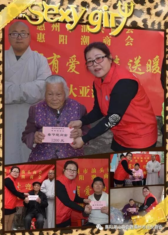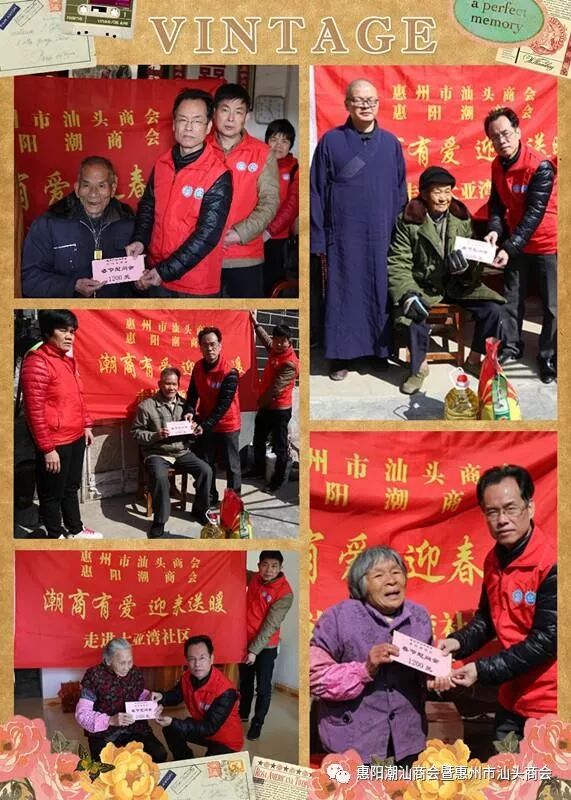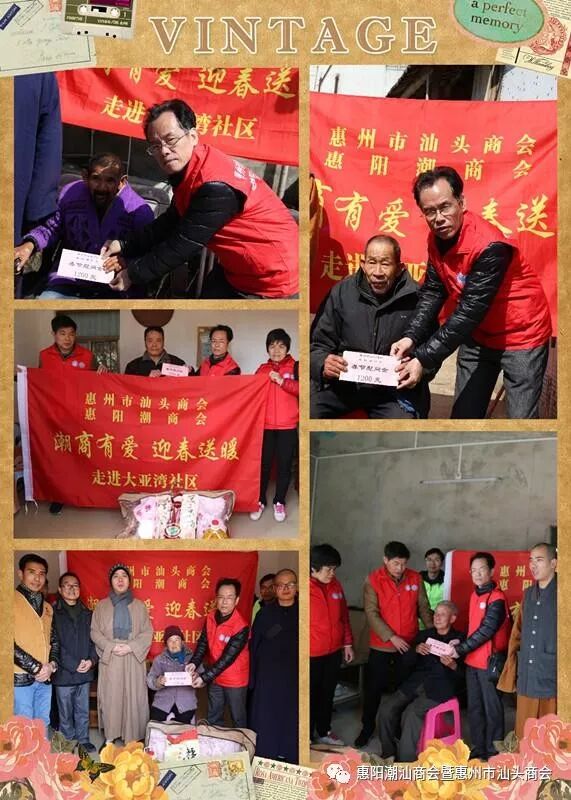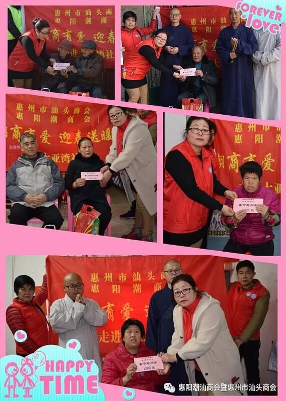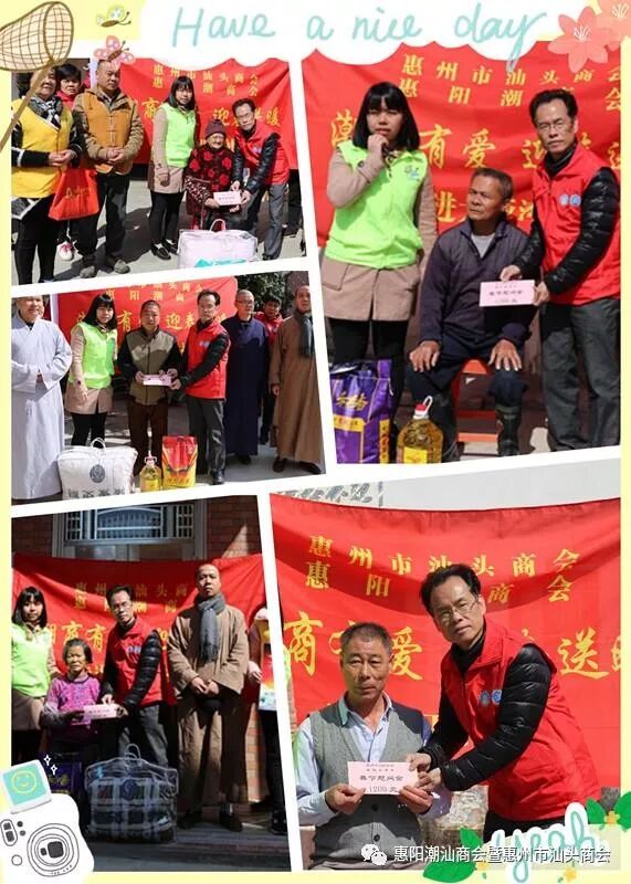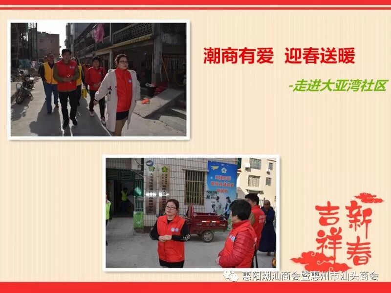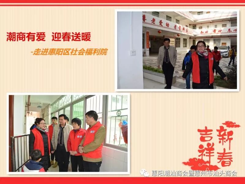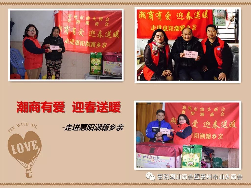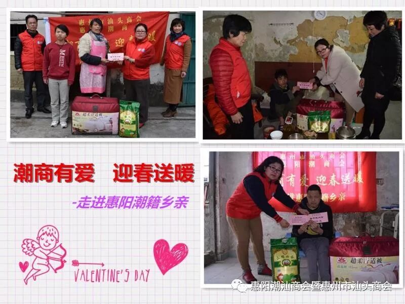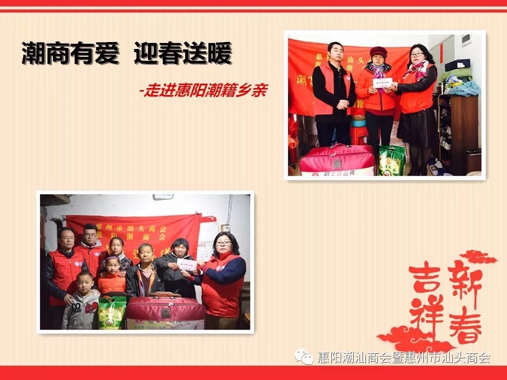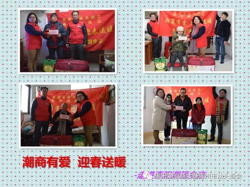 2月4日开始, 商会开展了为期四天的慈善系列慰问活动, 今年的主题是“潮商有爱, 迎春送暖”, 扶贫慈善小组组长丁萍、副组长胡镇城带队先后走进惠阳潮籍乡亲,慰问了17户潮籍贫困乡亲、病残人士,走进环卫系统,慰问了780多位环卫工人, 走进惠阳区社会福利院,慰问了该院40多位孤寡老人和孤儿, 走进大亚湾社区, 慰问了29户生活在大亚湾的五保户、空巢老人、残疾人, 为他们送去寒冬里的温暖, 传递真情, 奉献爱心, 这次活动, 是商会三年来系列慈善活动中规模最大、意义最深的一次, 彰显了潮商扶孤助残、乐善好施的优秀品质; 林茂、陈启光、张楚开、黄林周、姚祥波、郭春坛、温朝春、姚柳波、卓景绵、吴鸿财、郑昌明、周林省、丁萍13位爱心企业家捐款支持本次活动。