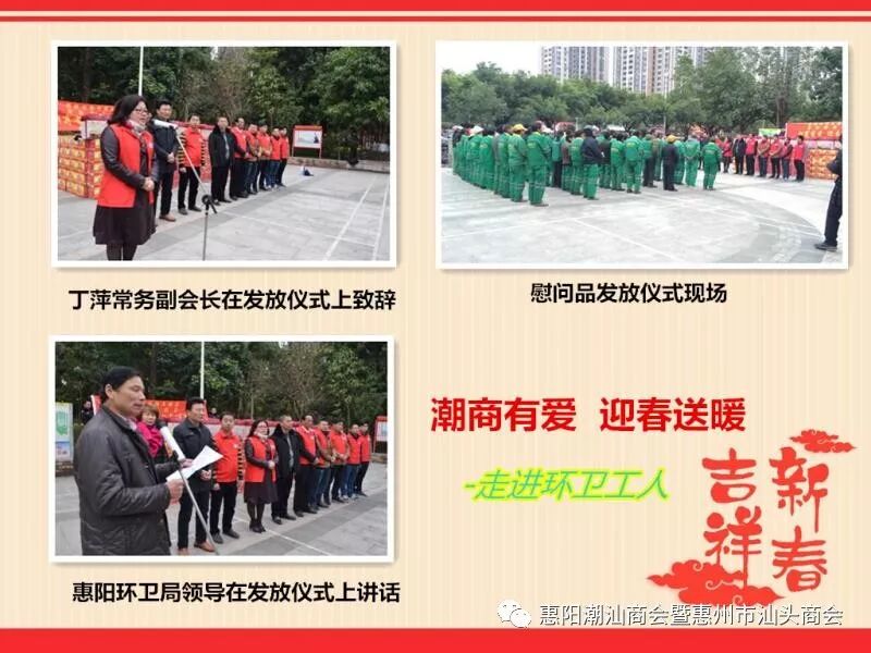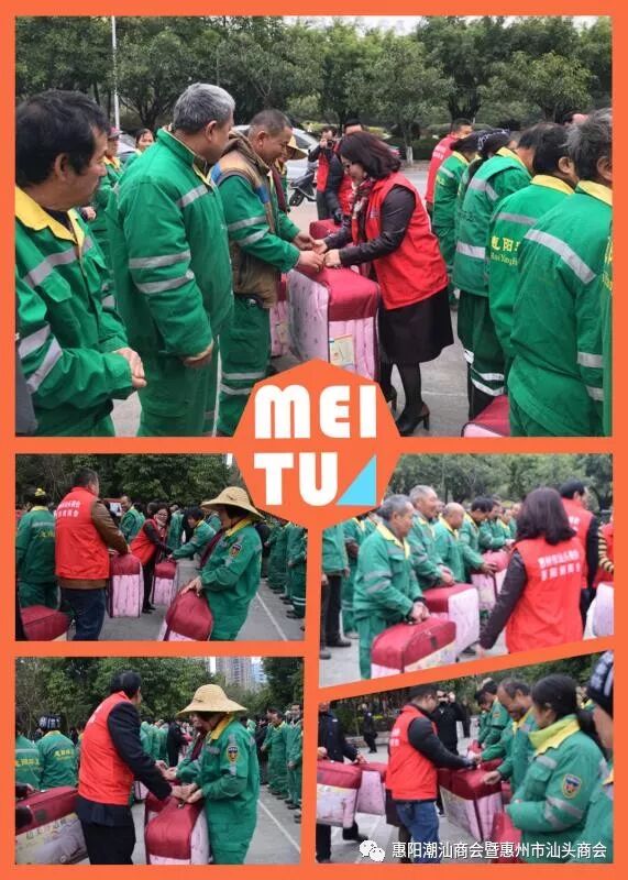 5日, 为体现潮商尊重劳动, 关爱环卫工人, 感恩城市美容师, 本次活动特意为惠阳区环卫系统的一线工人送去食品780箱, 棉被80床, 惠阳区环卫局局长吴卫瓯、党总支副书记黎土生、办公室主任蔡晓灵、工会主席吴伟帮, 我们商会常务副会长丁萍, 副会长黄俊强、吴妈文, 副秘书长胡镇城及志愿者、环卫工人等一百多人, 参加在淡水人民公园举行的慰问品发放仪式, 气温虽冷, 但现场洋溢着温馨欢乐的气氛, 环卫工人脸上露出明亮的笑容和喜悦。