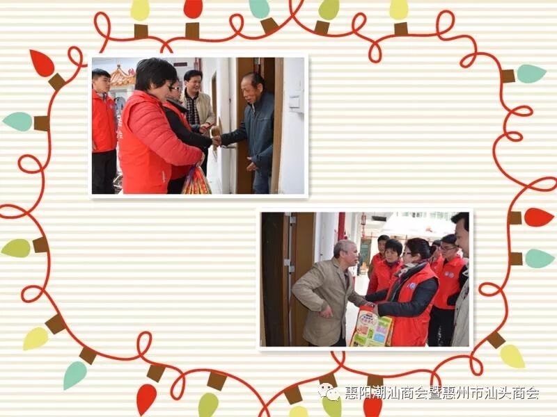 隆冬的季节, 寒意正浓, 扶贫慈善小组一行走街串巷, 分别为生活在淡水司前、爱民西路、叶挺东路、星河湾、花街、尧岭、坝尾、桥背、平潭镇红光村、大亚湾霞涌镇西片、西区惠丰城、坜下社区等的17户潮籍贫困乡亲、残障人士送去慰问金、棉被和大米, 接受慰问的乡亲们无不感激商会这个大家庭的浓情厚意, 无不感恩爱心企业家的亲切关怀。 慰问期间, 有三户家庭的情况让慰问人员深深表示同情, 其中有一户是白血病患者, 一户是小儿麻痹症患者(孤儿), 一户是乳腺癌患者, 获知此消息后,姚祥波、郑昌明、丁萍、黄俊强、胡镇城几位爱心人士,分别以个人的名义,另外向他们送去数额不等的慰问金, 希望这些点滴的关怀与温暖能鼓励他们战胜病魔, 重燃起对生活的希望。
