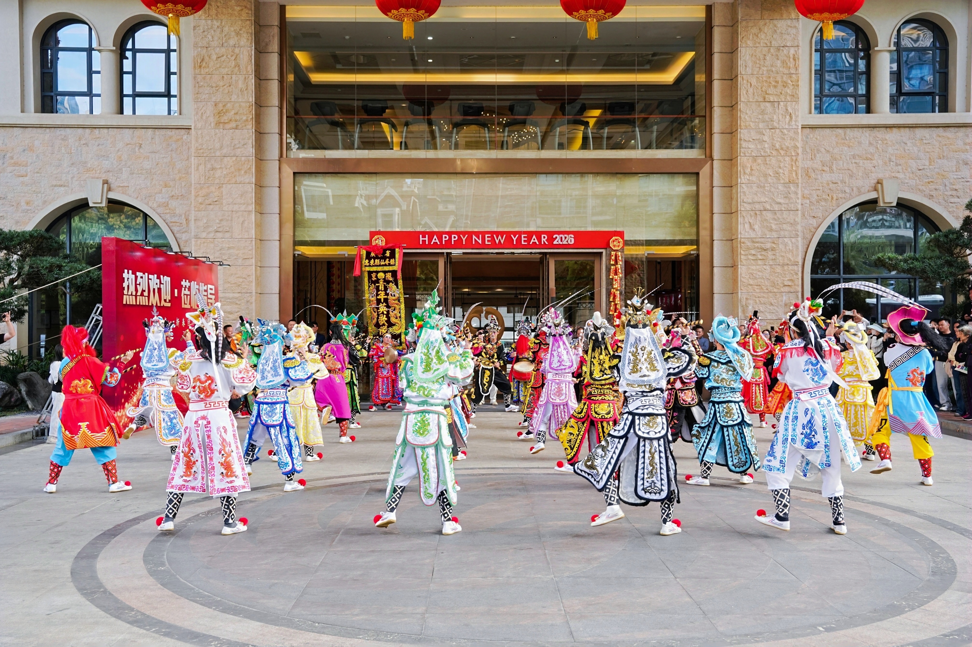 团拜会在庄严的国歌声中拉开帷幕,现场气氛热烈,喜庆祥和。会场内灯光璀璨,流光溢彩,英歌起舞,锣鼓喧天,充满浓厚的潮汕文化气息与新春佳节氛围。